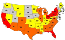The Uniformed and Overseas Citizens Absentee Voting Act (UOCAVA) lets overseas citizens and all military and merchant marine voters get ballots electronically (email, fax, or web site). They then submit ballots by mail to 19 states. Seven states allow submission through secure web sites: AL, AZ, CO (if needed), MA, MI,[89] NC, ND, and WV. These seven and the remaining 25 states have a mix of rules allowing email or fax:[88] AK, CA, DE, DC, FL, HI, IN, IA, KS, LA, ME, MS, MO, MT, NE, NV, NJ, NM, OK, OR, RI, SC, TX (for danger, combat zones or space[90][91]), UT, and WA.[88] The Federal Voting Assistance Program converts emails to fax at voter request, so states which require fax receive ballots which started as emails.[92]