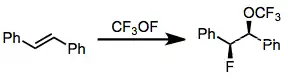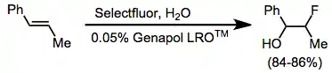 Simple fluorinations of alkenes often produce complex mixtures of products. However, cofluorination in the presence of a nucleophile proceeds cleanly to give vicinal alkoxyfluorides.[11] Alkynes are not fluorinated with N-F reagents. An anionic surfactant was used to facilitate contact between aqueous Selectfluor and the alkene.