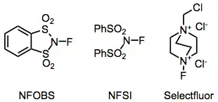 Some common fluorinating agents used for organic synthesis are N-fluoro-o-benzenedisulfonimide (NFOBS), N-fluorobenzenesulfonimide (NFSI), and Selectfluor.[1]