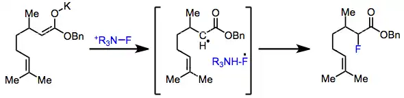 On the other hand, the lifetime of radicals in the SET process is predicted to be four orders of magnitude shorter than the detection limit of even the most sensitive of radical probes. It has been postulated that after electron transfer, immediate recombination of the fluorine radical with the alkyl radical takes place.[5]