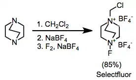 - ↑ Lal, G. S. (1993). "Site-Selective Fluorination of Organic Compounds Using l-Alkyl-4-fluoro-l,4-diazabicyclo[2.2.2]octane Salts (Selectfluor Reagents)". J. Org. Chem. 58: 2791.