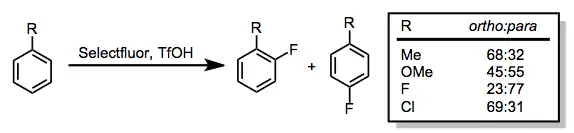 Fluorination of electron-rich aromatic compounds gives aryl fluorides. The two most common problems in this class of reactions are low ortho/para selectivities and dearomatization (the latter is a particularly significant problem for phenols).[12]