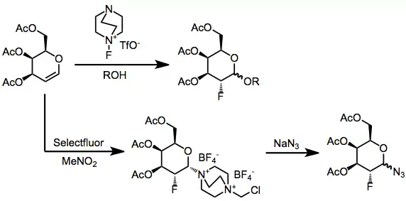 Enol ethers and glycals are nucleophilic enough to be fluorinated by Selectfluor.[13] Similar to other alkenes, cohalogenation can be accomplished either by isolation of the intermediate adduct and reaction with a nucleophile or direct displacement of DABCO in situ. Enols can be fluorinated enantioselectively (see above) in the presence of a chiral fluorinating agent.
