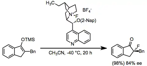 Enantioselective methods employ stoichiometric amounts of chiral fluorinating agents. N-fluoroammonium salts of cinchona alkaloids represent the state of the art for reactions of this type. In addition, these reagents are easily synthesized from Selectfluor and the parent alkaloids.[7]