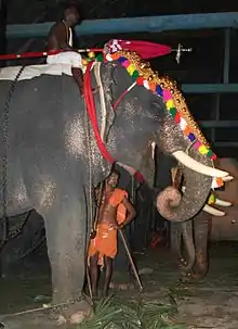 Almost all of the local festivals in Kerala include at least one richly caparisoned elephant. Elephants carry the deity during annual festival processions and ceremonial circumnambulations in the Hindu temples. The temple elephants are decorated with gold plated caparisons ("nettipattam"), bells, and necklaces. People mounted on the elephants hold tinselled silk parasols ("muttukuda") up high, swaying white tufts ("vencamaram") and peacock feather fans ("alavattam") to the rhythm of the orchestra.[4] Seventeen elephants are engaged for the daily ceremonial rounds to the accomplishment of Pancari Melam in Kudalmanikyam temple. The headgear of seven of these elephants is made of pure gold and rest of pure silver, which is unique to this temple. 15 elephants are caparisoned for the seevili at tripnithura poornathrayeesa temple vrishchikolsavam. This the biggest temple festival in the world. The elephant carrying lord poornathrayeesa will be decorated by swarna thalekkettu( nettippattam made of pure gold from the kings treseory).