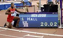 Elijah Hall-Thompson (born August 22, 1994) is an American track and field sprinter and American record holder in the indoor 200 meters.[7][6][5] At the NCAA Division I Championships he helped the Houston Cougars win and set the collegiate record in the 4 × 100 meters relay in 2018, and won both the 60 meters and the 200 meters at the NCAA Division I Indoor Championships in 2018.[8][5] His winning time of 20.02 seconds in the 200 meters is the second fastest time ever achieved over the distance indoors.