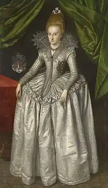 Elisabeth died on 25 March 1650 in Altenburg and was buried in the Brethren Church in Altenburg, to which she had donated a beaker.[1] The motto of the Duchess, who was with both an Albertine and an Ernestine,[2] was: All my delight is in God.[3] An oval gold ducats exists, depicting Elisabeth exists, showing her effigy on the obverse and a crowned "E" on the reverse. Elisabeth was a member of the virtuous society under the name the Pious.[4]