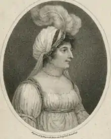 In 1791 she was kind enough to take in Elizabeth Clendining who she had met in Dublin. Clendinning had a short singing career before she retired to have a family, but her husband was in Dublin debtors' prison and she came to England to find work and she found work initially in Bath.[7] Mrs. Billington was not happy in her marriage, and even before she had appeared on the London stage rumour had been busy with her fair fame. In 1792 there appeared an anonymous publication, which professed to contain her private correspondence with her mother. This work was of so disgraceful and scurrilous a description that Mrs. Billington was forced to take legal proceedings against the publishers. An answer to the 'Memoirs' appeared in due course ; but it seems probable that the scandal induced Mrs. Billington to abandon her profession and retire to the Continent. Accompanied by her brother and her husband, she left England early in 1794, and travelled by way of Germany to Italy. At Naples she was induced by Sir William Hamilton, the English ambassador, to sing in private before the royal family. This led to her singing at the San Carlo, where she appeared in a new opera, 'Inez di Castro,' written expressly for her by Francesco Bianchi, on 30 May 1794. Her singing created an extraordinary impression, but her triumph was cut short by the sudden death of her husband, which took place the day after her first appearance, as he was preparing to accompany his wife to the theatre, after dining with the Bishop of Winchester. She stayed at Naples sixteen months, and then sang at Florence, Leghorn, Milan, Venice, and Trieste. In 1797, when singing at Venice, she was prostrated with a severe illness for six weeks. On her recovery the opera house was illuminated for three nights. [4]