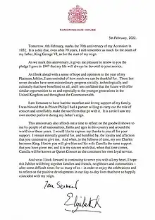 The Jubilee marked the 70th anniversary of the accession of Queen Elizabeth II on 6 February 1952.[2][3]