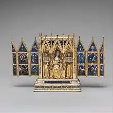The Queen was a renowned patron of arts and founder of many shrines which she fitted with wonderful treasures.[4] The exquisite examples of Queen's foundation includes silver Reliquary Shrine with Virgin and Child from about 1350 in the Metropolitan Museum of Art, attributed to Jean de Touyl,[5] most probably created for the convent of the Poor Clares of the Order of Saint Francis at Buda, also founded by the Queen in 1334[4] and silver reliquary of Saint Nicholas in the form of a gothic church from 1344, attributed to Pietro di Simone Gallico in the Museo Nicolaiano in Bari.[6] Elizabeth also inspired the foundation of the Hungarian Chapel in Aachen and sponsored some of its treasures.[4][7]