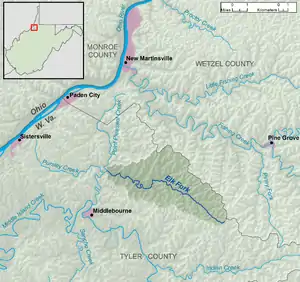 The Elk Fork is a tributary of Point Pleasant Creek, 14.8 miles (23.8 km) long,[3] in northwestern West Virginia in the United States. Via Point Pleasant Creek, Middle Island Creek, and the Ohio River, it is part of the watershed of the Mississippi River, draining an area of 21.1 square miles (55 km2)[4] in a rural region on the unglaciated portion of the Allegheny Plateau.