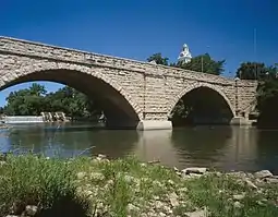 The Elkader Keystone Bridge is a historic structure located in Elkader, Iowa, United States. The old iron truss bridge that crossed the Turkey River at this location was declared unsafe in 1888. The Clayton County Board of Supervisors decided to construct a bridge of native limestone as way of saving money and providing a reliable crossing. Engineer M. Tschirgi designed the structure and Dubuque stonemasons Byrne and Blade constructed the bridge. It was built at a cost of $16,282, and spans the river for 346 feet (105 m).[2] This is one of the largest twin arched keystone bridges west of the Mississippi River.[3] A sidewalk was added on the north side of the structure in 1924. The bridge was individually listed on the National Register of Historic Places in 1976.[1]