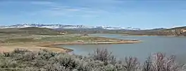 A view of Elkhead State park including Elkhead Reservoir with the Elkhead Mountains in the distance.