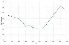 The graph (as pictured) from the census returns show that the population of Ellington, as reported in 1851 was around 450. It reached its lowest point in 1931 when the population of the parish dropped to just above 217 and since then the population of Ellington rose to 624 in 2001. The most recent census data from 2011 shows that there has been the first drop in the population figures in 100 years, since 1911.[21][22]