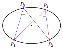 If and are two points of the ellipse such that , then the points lie on two conjugate diameters (see below). (If , the ellipse is a circle and "conjugate" means "orthogonal".)