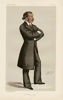 Ashmead-Bartlett was elected as Member of Parliament (MP) for Eye, Suffolk, in the 1880 general election.[6] In 1882 his caricature by "Spy" was published in the British weekly magazine Vanity Fair (21 October 1882) under the title "The Patriotic League". The Eye constituency was redefined under the Redistribution of Seats Act of 1885, and in the general election of 1885 he ran for, and won, Sheffield Ecclesall constituency, which he held until his death in 1902.[7] He served as Civil Lord of the Admiralty in the governments of Lord Salisbury from 1885 to February 1886 and August 1886 to 1892.[4] He was knighted in the 1892 Dissolution Honours.