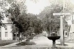 ![]() East Elm Street from the Main Street intersection in the 19th century. The circular horse trough in view now stands at the nearby intersection of Main and Center streets | |