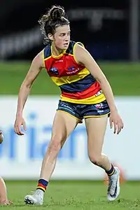 Jones was drafted by Adelaide with their third selection and twenty-fourth overall in the 2017 AFL Women's draft.[2][13] Joining Adelaide she linked up again with coach Bec Goddard who coached her at the AFL Women's Under 18 Championships and with her idol Erin Phillips.[14] Jones made her debut in the twelve point loss to Brisbane at Norwood Oval in the opening round of the 2018 season.[15] Jones received a nomination for the 2018 AFL Women's Rising Star award after kicking two goals in Adelaide's round 5 win against Carlton.[3] In March 2019, Jones was selected for the initial 40-player 2019 AFL Women's All-Australian team.[16] However, she wasn't selected for the final squad.[17] In March 2020, Jones was selected for the AFL Players Association's inaugural AFL Women's 22under22 team.[18][19]