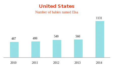After the release of Disney's Frozen at the end of 2013, in which a main character is named Elsa, the name became more popular in different countries across the world. In the Faroe Islands and Sweden the name was in the top 10 baby names before the film was released, and became the most popular name afterwards, in 2014 and 2015.[1]