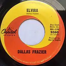 Frazier's version peaked at No. 72 on the Billboard Hot 100, and was a top 40 hit in Canada, reaching No. 27.[2] A number of other artists recorded the song through the years with varying degrees of success, most notably Kenny Rogers and the First Edition.[3] Rogers' version appeared on the album Something's Burning, which reached the top 30 of the Billboard 200. In 1978, alternative country recording artist Rodney Crowell recorded his cover of "Elvira" (with "Ashes by Now" on the B-side).[4] Crowell's version hit No. 95 on Billboard's country chart.[3]