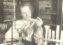 Gudriniece's basic research focused on organic synthesis and the practical use of substances for medicines, cosmetics, and industry. She synthesized furacilin and developed a method of utilizing it for industrial purposes, which earned her the Latvian Soviet Socialist Republic Prize in 1957.[2] She studied chloromethylated nitration, sulfonation,[4] and the reactivity of cyclic 1,3-diketones,[3] publishing over 600 scientific reports on theoretical and synthetic chemistry of heterocyclic and 1,3-dicarbonyl compounds. Her most recent work focused on studies of rapeseed oil in attempts to develop techniques for the separation of lipids and refining of rapeseed oil as an industry in Latvia.[1] She was one of the first to recognize the application of vegetable oils for biofuels.[2] She also served on the editorial board of the Latvian Journal of Chemistry[3] and at the time of her death was coauthor of the only textbook in the Latvian language on organic synthesis methods.[2] Gudriniece received many honors, including the Gustavs Vanags Prize for Chemistry in 1972,[1] the Vladimir Vasilevich Chelintsev Memorial Medal,[2] election as an academician in the Latvian Academy of Sciences in 1978,[3] Latvian Emeritus State Scientist in 1996, Professor Emeritus from the Riga Technical University in 2000, the Paul Walden Medal in 2000,[1] and the Grindeks Award for her contributions to education in 2003.[2]