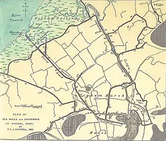 As a specimen[46] of his maps, Spurrell published the one shown here. It had a network of walls enclosing reclaimed marshland near Higham, Kent. The highest walls were the current tidal defences; progressively lower walls lay inland and were (he said) the old defences. The Thames at high spring tides continued to deposit mud on the Saltings but of course not on the landside areas; these were now lower. This was an instance of land reclamation by successive 'inning' of marshland (see below).[47]