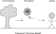 Proponents of the embodied cognition thesis emphasize the active and significant role the body plays in the shaping of cognition and in the understanding of an agent's mind and cognitive capacities. In philosophy, embodied cognition holds that an agent's cognition, rather than being the product of mere (innate) abstract representations of the world, is strongly influenced by aspects of an agent's body beyond the brain itself.[1][3] An embodied model of cognition opposes the disembodied Cartesian model, according to which all mental phenomena are non-physical and, therefore, not influenced by the body. With this opposition the embodiment thesis intends to reintroduce an agent's bodily experiences into any account of cognition. It is a rather broad thesis and encompasses both weak and strong variants of embodiment.[2][4][3][5][6] In an attempt to reconcile cognitive science with human experience, the enactive approach to cognition defines "embodiment" as follows:[2]