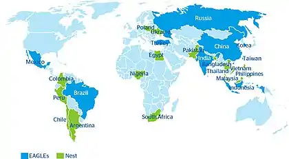 As part of the EAGLEs proposal, the EAGLEs' Nest is a second set of countries with expected Incremental GDP in the next decade to be lower than the average of the G6 economies (G7 excluding the U.S.) but higher than Italy's (G6 Minimum), the country which is anticipated to contribute least to global growth within the G7. The membership of the EAGLEs' Nest is subject to a yearly revision and can change according to forecasted economic performances.