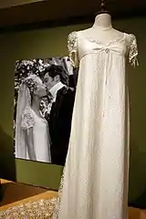 Emma's wedding dress was made from silk crepe and embroidered with a small sprig pattern, while the sleeves and the train were made from embroidered net.[20] Of the dress, Myers stated "The inspiration for Emma's wedding dress began with a small amount of exquisite vintage lace that became the overlay. I wanted a look that would work not only for the period but also one that would compliment [sic] Gwyneth Paltrow's youth, swan neck, and incredible beauty. I was also hoping to evoke happiness and the English countryside; the sun did shine on the day we shot the scene!"[20]