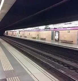 Encants is a Barcelona Metro station in the Eixample district of Barcelona, served by L2. It opened in 1997. It is located under carrer de València between carrer del Dos de Maig and carrer de la Independència, and is accessible from both sides of the intersection of carrer de València and Dos de de Maig.