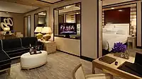 The Encore hotel tower is nearly identical to the one at Wynn Las Vegas, both using bronze glass.[34] The Encore tower is 48 stories,[36] although its top floor is labeled "63". Due to bad-luck superstitions among gamblers, the tower skips the 13th floor (triskaidekaphobia) and those containing the number 4 (tetraphobia).[26][37] Encore opened with 2,034 hotel rooms.[38][13][19] The rooms were remodeled in 2015,[39] and a $200 million hotel renovation project was announced for both Wynn and Encore in 2021.[40]