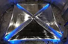 A fully deployed solar sail system at the NASA Glenn Research Center's Plum Brook Space Power Facility, the world's largest space environment simulation chamber, in Sandusky. The development of these sails has been critical for future robotic space exploration and the chamber will be featured in the upcoming motion picture "The Avengers".[59]