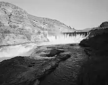 The Enloe Dam, also known as the Similkameen Dam, and its powerplant are located on the Similkameen River about 4 miles (6.4 km) west-northwest of Oroville, Washington. Located just above Similkameen (Coyote) Falls, the concrete arch-gravity dam stands about 54 feet (16 m) high, with a crest length of about 290 feet (88 m), built between 1916 and 1923. The dam was named after the president of the Okanogan Valley Power Company, Eugene Enloe. The dam was operated to generate power at its powerplant, located about 850 feet (260 m) downstream from the dam.[2] Lacking fish ladders, Enloe Dam blocks fish passage and completely extirpated anadromous fish migration into the upper reaches of the Similkameen River and its tributaries in Canada.[3]