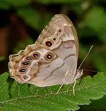 The wingspan is 56–70 mm. The upperside is brown with dark eyespots at the margins. The underside is light brown. Adults feed on sap, rotting fruit, carrion and dung.
