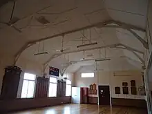 The hall is a single open space with six visible trusses spanning the width of the room. The truss members are curved in form and are rounded where the supports meet the main members. Five rows of ceiling panels are fixed between the truss members with a symmetrical geometric pattern being formed by banding over panel joints which continues down the height of the walls. This geometry complements that of the windows located at the front of the space and corresponds to the fenestration that runs the length of the hall. The second and fourth ceiling panels have patterned ceiling vents at their centres.