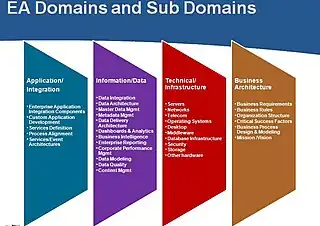 The Enterprise Architecture Reference Traditional Model offers a clear distinction between the architecture domains (business, information/data, application/integration and technical/infrastructure). These domains can be further divided into Sub domain disciplines. An example of the EA domain and subdomains is in the image on the right.
