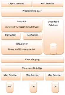 - Conceptual layer API, the runtime that exposes the programming model for coding against the conceptual schema. It follows the ADO.NET pattern of using Connection objects to refer to the map provider, using Command objects to send the query, and returning EntityResultSets or EntitySets containing the result.
