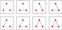 The eight graphs on three vertices (before identifying isomorphic graphs) are shown at the right. There are four isomorphism classes of graphs, also shown at the right.