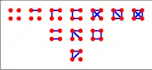 Rooted ternary trees on 0, 1, 2, 3 and 4 nodes (=non-leaf vertices). The root is shown in blue, the leaves are not shown. Every node has as many leaves as to make the number of its children equal to 3.