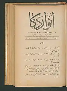 The journal Envâr-ı Zekâ (meaning Lights of Intelligence in English) was published between 1883 und 1885 (in the original between 1299 and 1302) by the Ebüzziya Printing House[1] by the writer Mustafa Reşid[2] in a total of 34 issues.[3] The magazine defined itself as a “biweekly journal addressing everything but politics”.