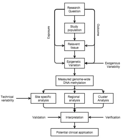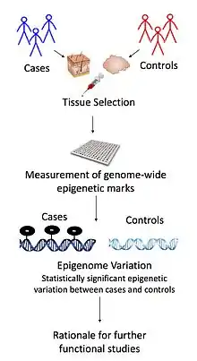 - ↑ Flanagan, JamesM. (2015-01-01). "Epigenome-Wide Association Studies (EWAS): Past, Present, and Future". In Mukesh Verma (ed.). Cancer Epigenetics. Methods in Molecular Biology. Vol. 1238. Springer New York. pp. 51–63. doi:10.1007/978-1-4939-1804-1_3. ISBN 978-1-4939-1803-4. PMID 25421654. S2CID 26438164.
