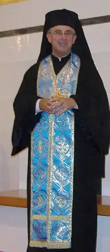 The epitrachelion (Greek: ἐπιτραχήλιον "around the neck"; Slavic: Епитрахи́ль - Epitrakhíl’; often called simply a stole in casual English-language usage) is the liturgical vestment worn by priests and bishops of the Orthodox Church and Eastern Catholic Churches as the symbol of their priesthood, corresponding to the Western stole. It is essentially the orarion adapted for priests and bishops, worn around the neck with two ends of equal length hanging down in front of the clergyman's body (more or less to the ankle) and with the two adjacent sides sewn or buttoned together up the center, leaving enough space through which to place the head. In practice, the epitrachelion is made to be worn only this way, tailored to lie flat around the neck, and is never actually unfastened. The portion hanging down in front is sometimes even a solid piece of fabric. It is usually made of brocade with seven embroidered or appliquéd crosses, one at the back of the neck and three down each side.[1] The epitrachelion is the only required vestment whenever a priest is conducting an Orthodox service; without it, he is unable to perform the service.