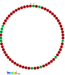 V-snoRNA1 is a box CD-snoRNA identified in B lymphocytes infected with the Epstein–Barr virus (human herpesvirus 4 (HHV-4)).[1] This snoRNA is the first known example of a snoRNA expressed from a viral genome.[2] It is homologous to eukaryotic snoRNAs because it contains the C and D boxes sequence motifs but lacks a terminal stem-loop structure. The nucleolar localization of v-snoRNA1 was determined by in situ hybridization. V-snoRNA1 can form into a ribonucleoprotein complex (snoRNP) as co-immunoprecipitation (CoIP) assays showed that this snoRNA interacts with the snoRNA core proteins, fibrillarin, Nop56, Nop58. It has also been proposed that this snoRNA may act as a miRNA-like precursor that is processed into 24-nucleotide-sized RNA fragments that target the 3'UTR of viral DNA polymerase mRNA.[1]