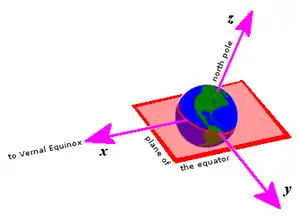 • A right-handed convention, specifying a y axis 90° to the east in the fundamental plane and a z axis along Earth's north polar axis.