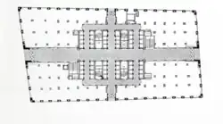 The Equitable Building has no setback from the street beyond the depth of the sidewalk.[24] This is because Graham wanted the building to have the latest technological systems, such as elevators, heating, ventilation, and fireproofing, while also maximizing usable office space.[10][13] Two light courts (recesses), one each to the east and west, bisect the facades above the seventh floor.[9][25] As a result, the Equitable Building appears in the shape of the letter H when viewed from above.[7][17][26] The design of the Equitable Building is similar to that of the now-demolished Hudson Terminal office buildings and the 49 Chambers building.[17] The two-story penthouse is 30 feet (9.1 m) tall;[7] the penthouse roof is 20 feet (6.1 m) tall, but the center tower rises another 10 feet (3.0 m).[20]