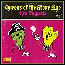 While 2002's Songs for the Deaf was said to be inspired by frontman Josh Homme's tedious drives through the Southern Californian desert, the inspiration for Era Vulgaris came from his daily drives through Hollywood.[10] He described the record as "dark, hard, and electrical, sort of like a construction worker"[11] and said "it's like dirt, clearly seen".[12] The album's title refers to the Latin term for Common Era. The title was chosen by Homme because he thought "it sounds like 'the Vulgar Era', which I like, because that sounds like something that I would like to be part of... I mean I think we're in it, and I'm stoked".[12] Two tracks from the album had previously been released or performed elsewhere. "Into the Hollow" had been performed by Homme and Chris Goss as The Fififf Teeners (with the two also producing Era Vulgaris),[5] and "Make It wit Chu" had been recorded as a Desert Sessions track,[13] as well as appearing on the live album Over the Years and Through the Woods.