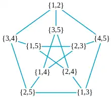 This is a graph with a vertex for each -element subset of an -element set, and an edge between every pair of disjoint sets. An independent set is a collection of vertices that has no edges between its pairs, and the independence number is the size of the largest independent set.[4] Because Kneser graphs have symmetries taking any vertex to any other vertex (they are vertex-transitive graphs), their fractional chromatic number equals the ratio of their number of vertices to their independence number, so another way of expressing the Erdős–Ko–Rado theorem is that these graphs have fractional chromatic number exactly .[5]