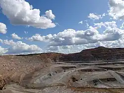 The city was built in 1974 to exploit Asia's largest deposit of copper ore and is the fourth largest copper mine in the world.[1] The Erdenet Mining Corporation is one of the Mongolian state-owned enterprises and accounts for a majority of Mongolia's hard currency income. Erdenet mines 22.23 million tons of ore a year, producing 126,700 tons of copper and 1954 tons of molybdenum.[2] The mine accounts for 13.5% of Mongolia's GDP and 7% of its tax revenue.[3] The mine employs about 8,000 people.[4]