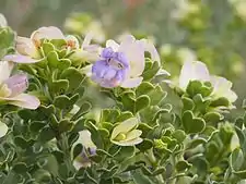 Eremophila cuneifolia, commonly known as pinyuru,[2] is a flowering plant in the figwort family, Scrophulariaceae and is endemic to the north-west of Western Australia. It is a spreading, sticky shrub with wedge-shaped leaves, coloured sepals and usually deep purple flowers.