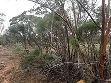This eremophila is common between Balladonia, Coolgardie, Hyden, Cocklebiddy and Salmon Gums in woodland, growing in red-brown and calcareous soils.[2][3][8][9]